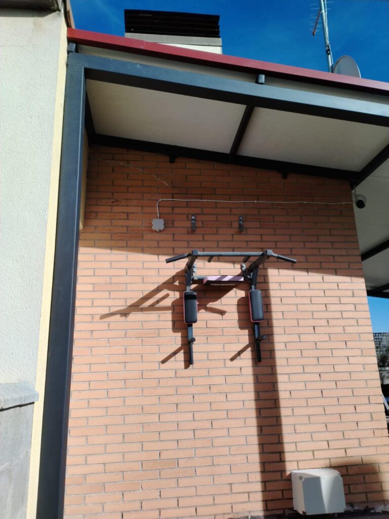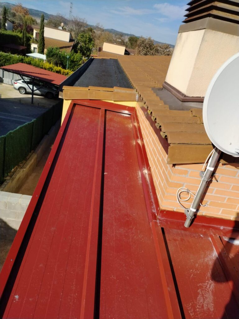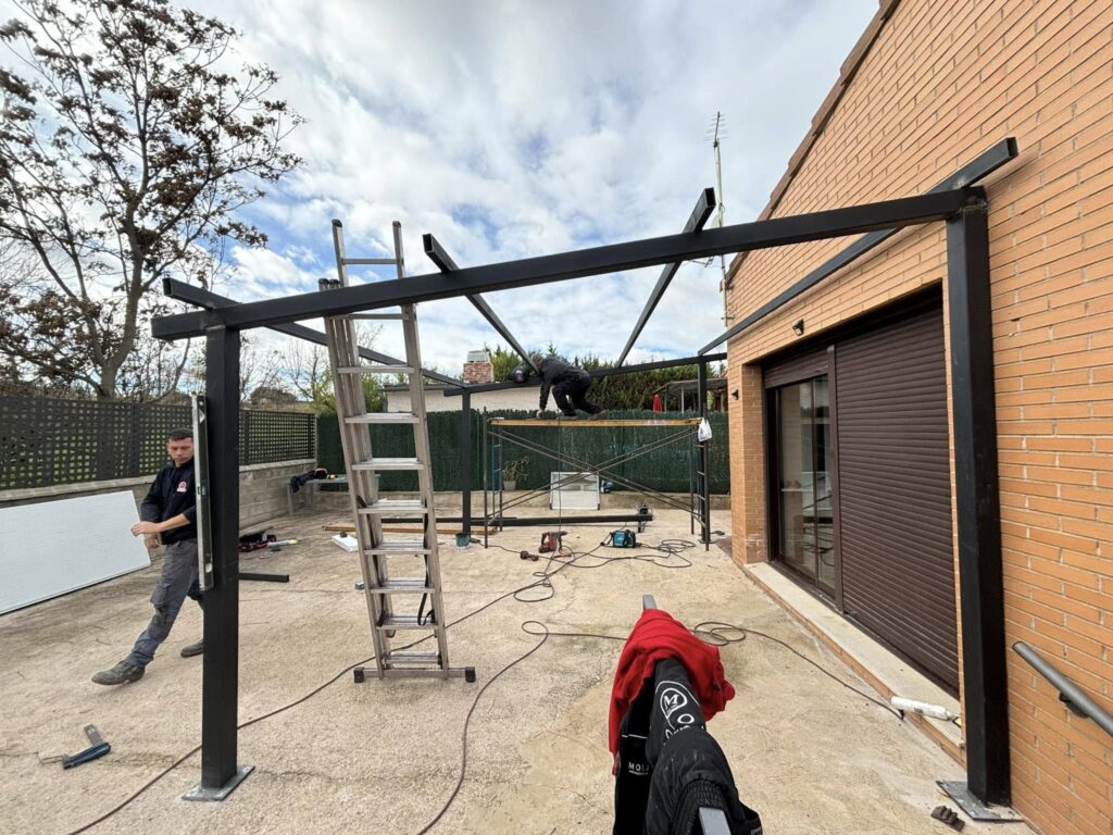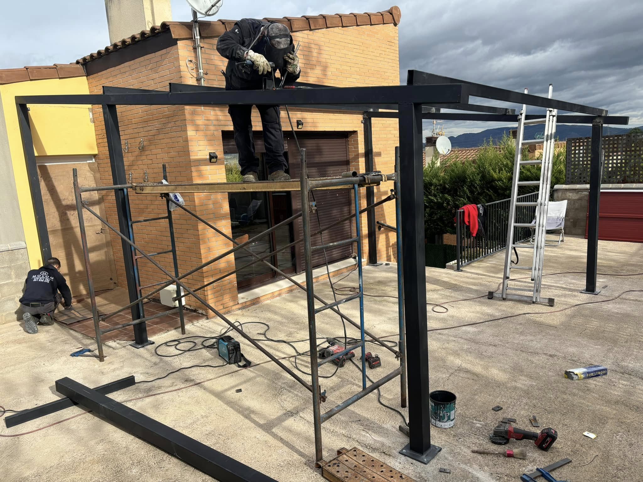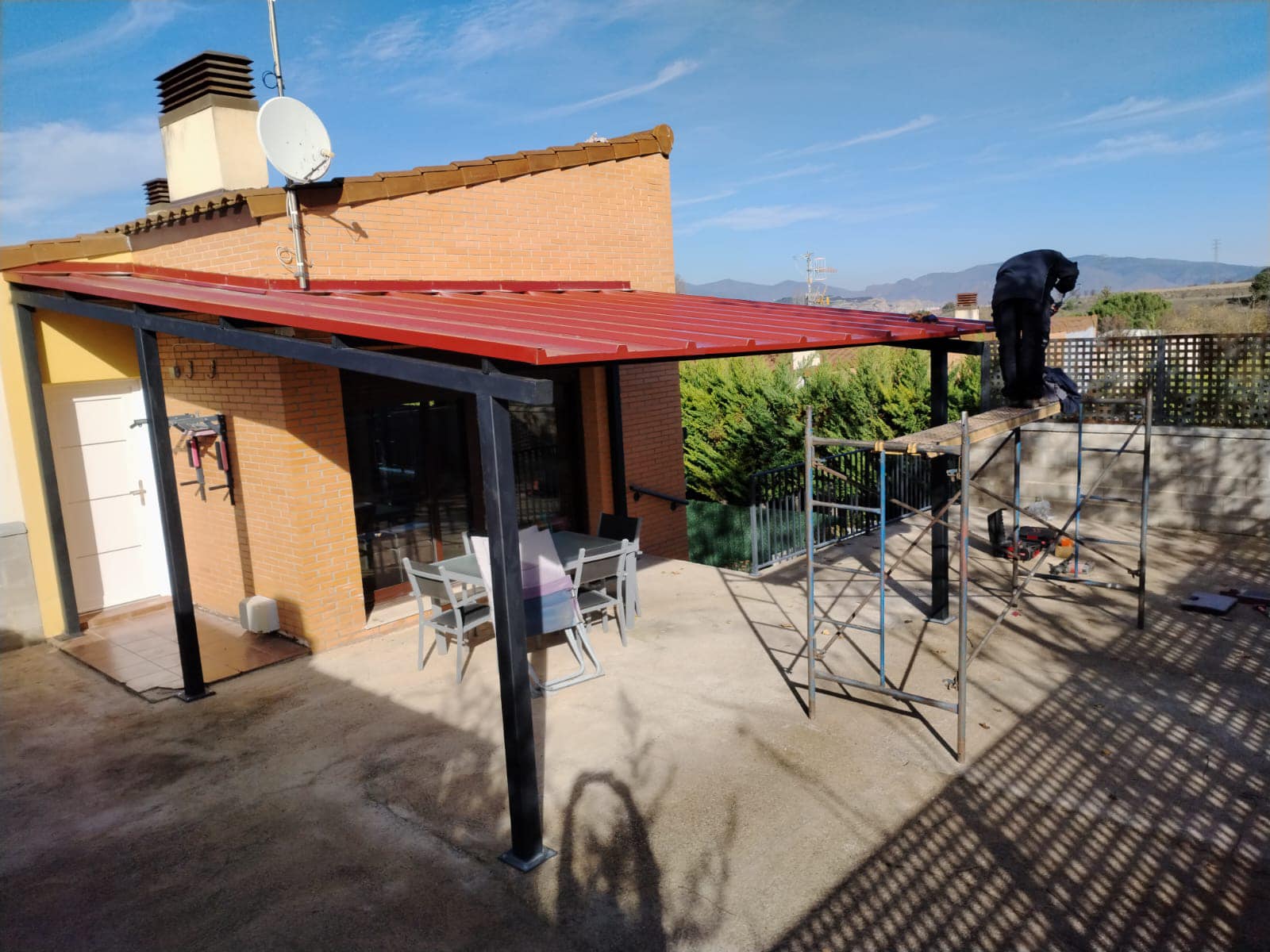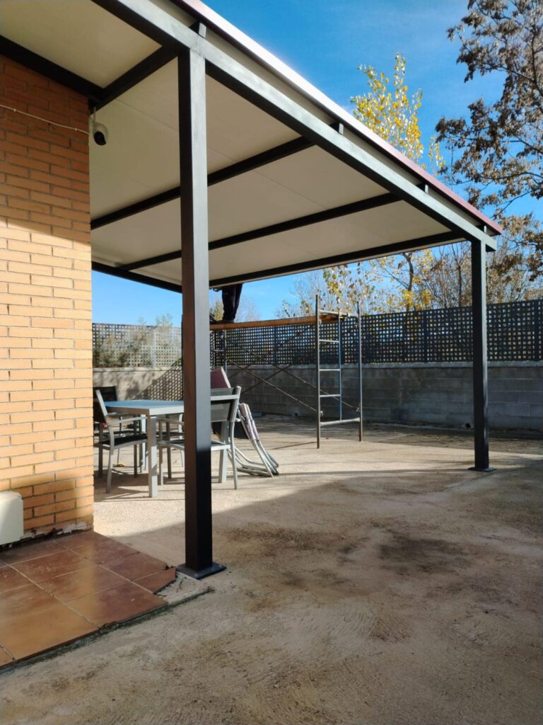 Fabricación, suministro y montaje de estructura metálica soldada, con cubierta de panel tipo sándwich de 30mm, remates incluidos. Estructura soldada, protegida de imprimación roja antioxidante y capa final oxiron forja negro pavonado. Estructura metálica porche/cenador parte trasera del chalet. Terraza.
