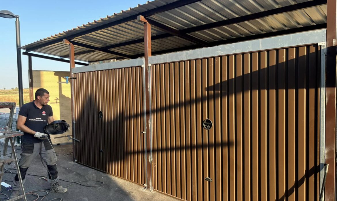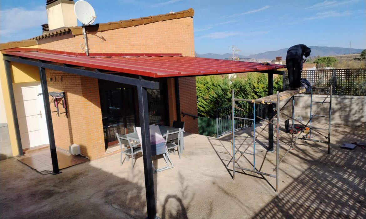 Fabricación en taller, suministro y montaje de estructura metálica soldada y cubierta para salvaguardar motos de reparto. Estructura acabada en imprimación roja antioxidante y capa...
