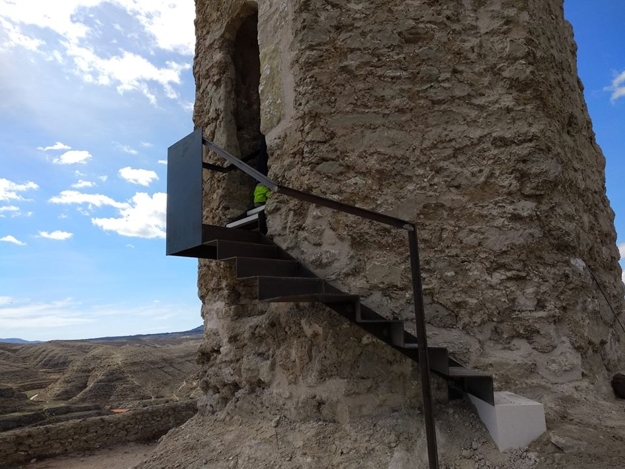 Estructura metálica/ escalera para acceso al restaurado torreón de la torre mocha, uno de los cinco castillos del conjunto fortificado de Calatayud. Fabricación en taller,...